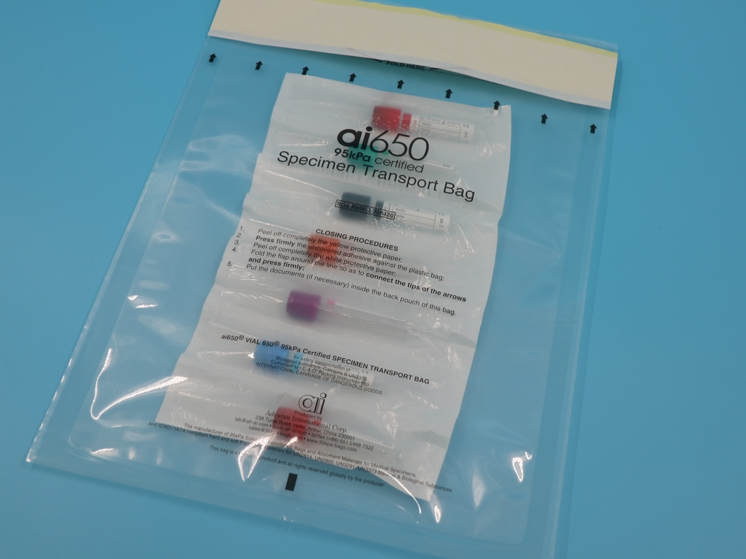 Las bolsas con certificación de 95 kPa cuentan con un sello patentado resistente a fugas.Los tubos de muestras y otros materiales pueden sellarse con seguridad dentro del bolsillo delantero de la bolsa al quitar la cinta blanca y doblar el adhesivo para cubrir la abertura.